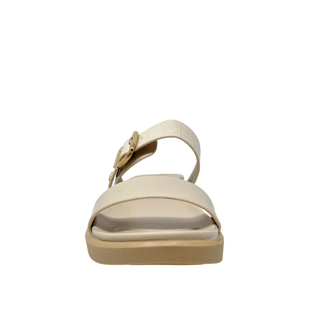 Sandalias flats Valia para mujer color beige, en cuero con Zero G. Suelas ligeras y flexibles, forros suaves y plantilla de látex de alta memoria.