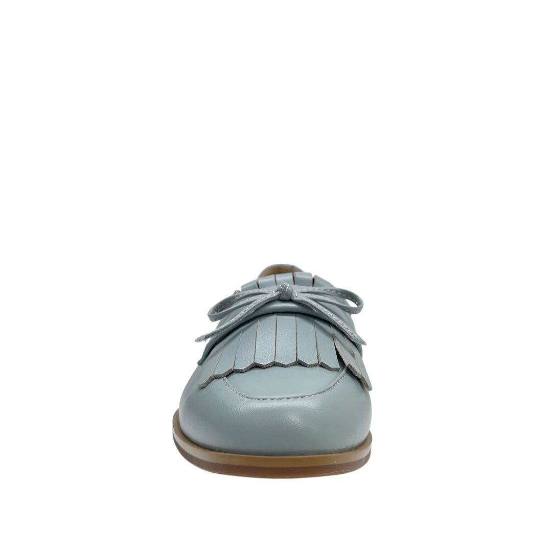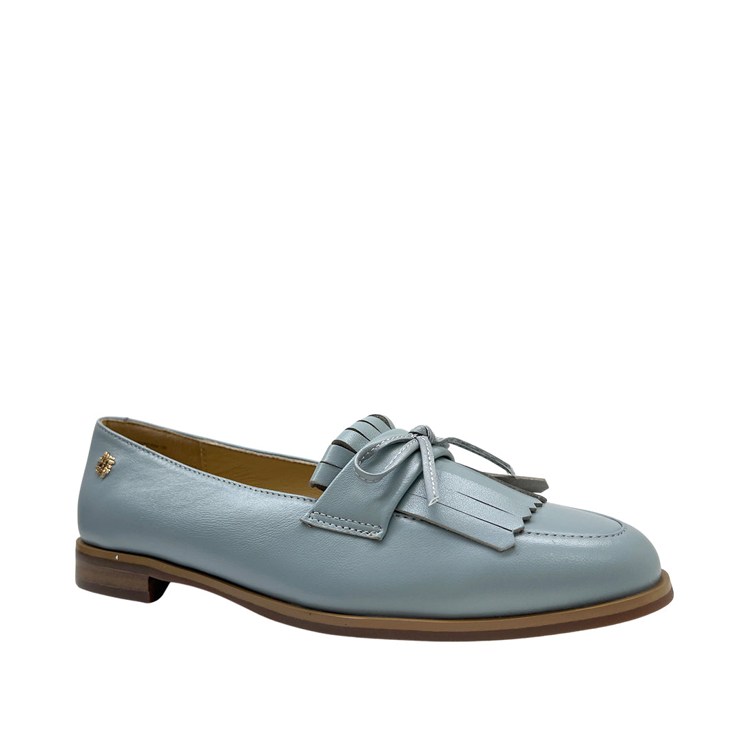 Mocasines Eleonora 6 para mujer color celeste, elaborados en cuero y con tecnología Bounce™. Incluyen plantilla extraíble de alta memoria que aporta rebote, recupera su forma y brinda comodidad y durabilidad durante todo el día.