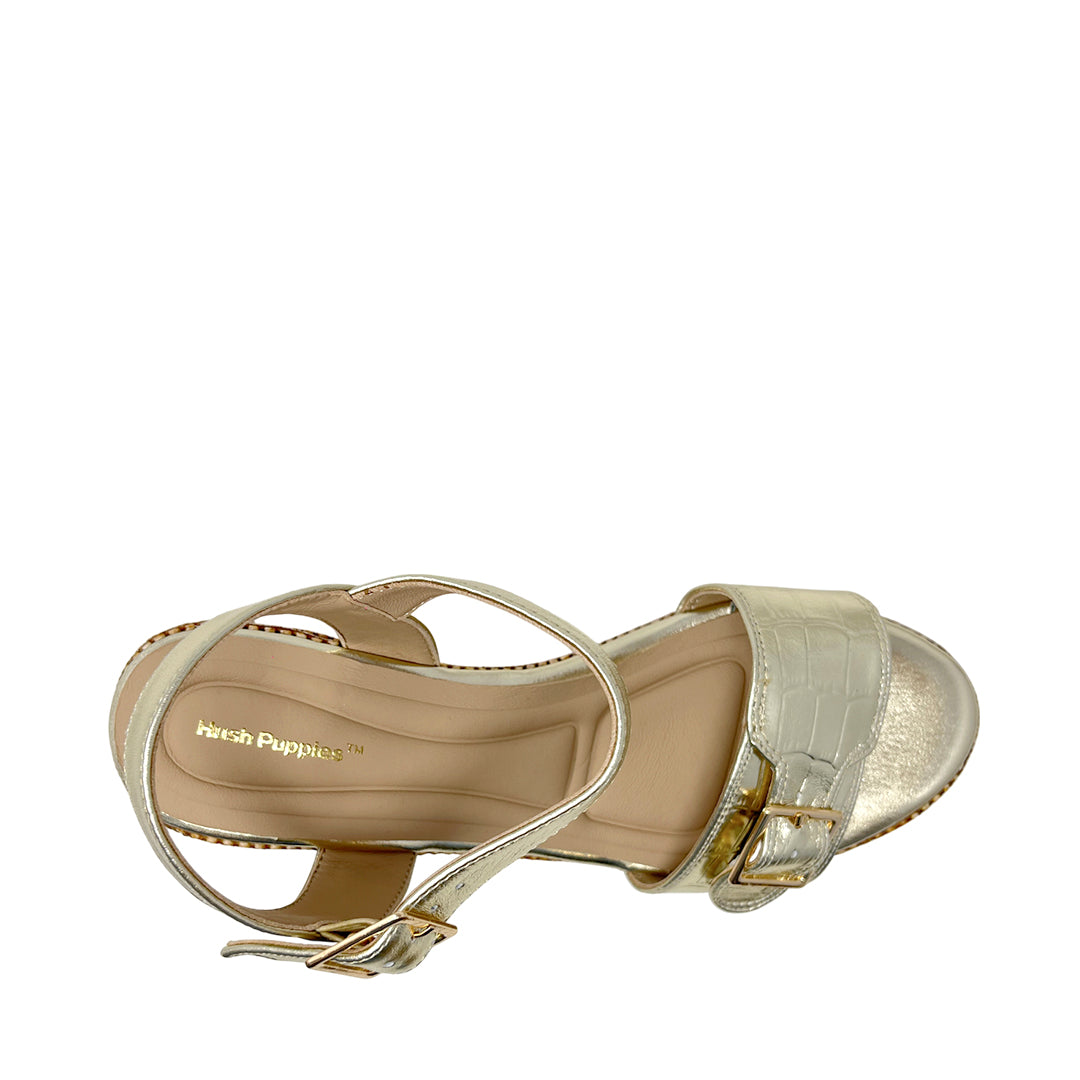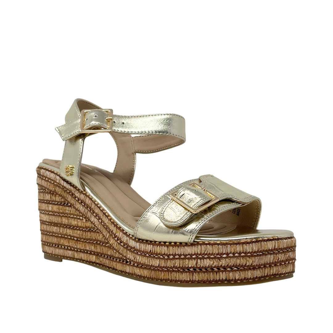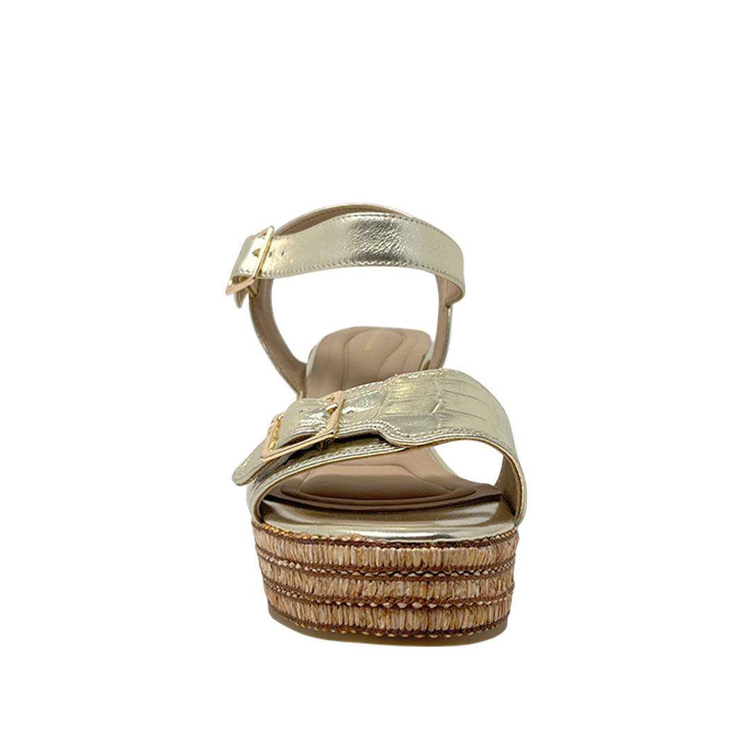 Sandalias de cuña Angie para mujer color dorada, en cuero. Altura con estabilidad y comodidad para ocasiones especiales o diario.
